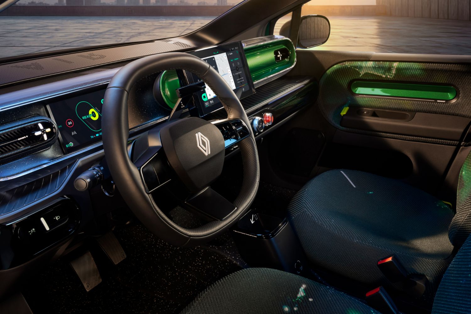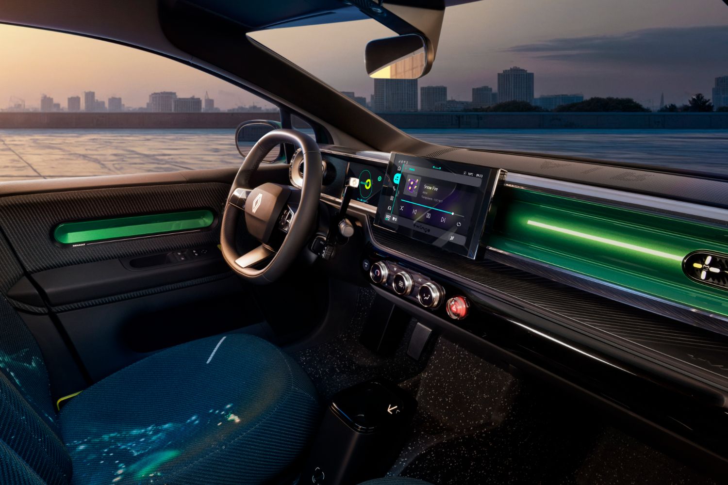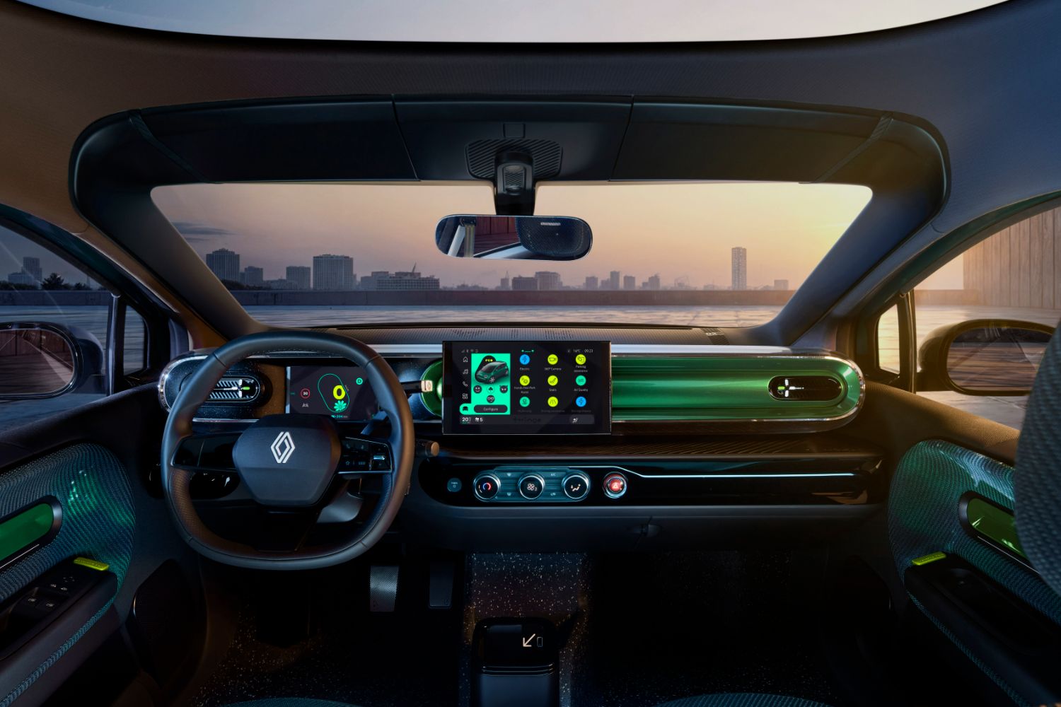 Inspired by the original, but of a far higher quality level and in another league when it comes to in-car technology. The dashboard is, therefore, a cylindrical shape like the classic model, yet it is now studded with a 10.1-inch central multimedia touchscreen, as well as a seven-inch digital instrument cluster. Both of these have their own unique graphics to enhance the sense of fun within the Twingo E-Tech, while another little touch to visually evoke the 1990s original is the hazard warning lights switch being housed in a translucent bubble next to the aircon controls.