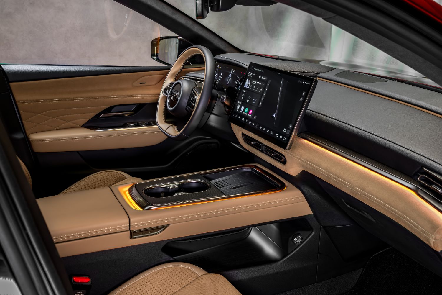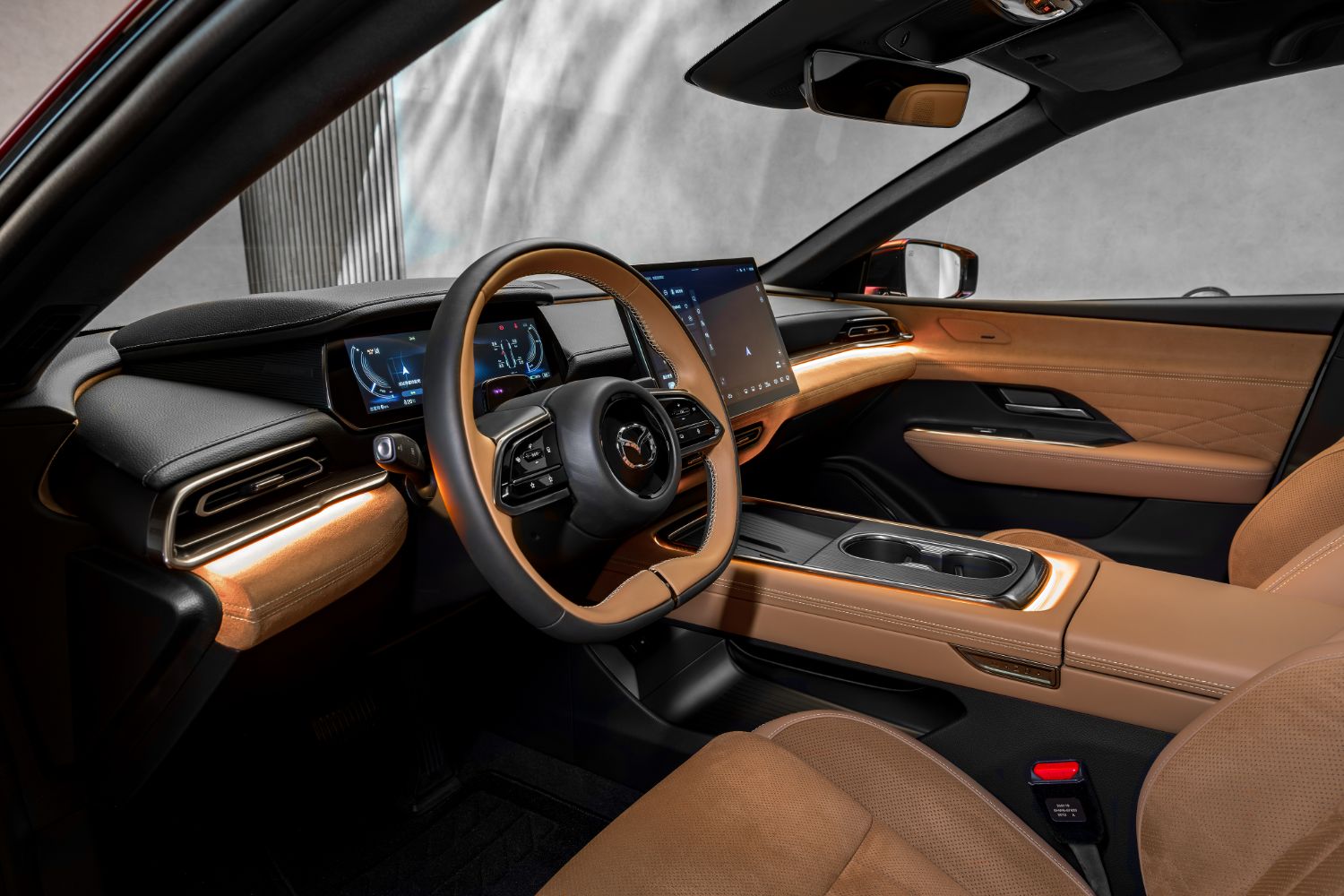Moving inside, a full panoramic roof floods the cabin with natural light, while a heavily digitised human-machine interface is centred on a huge 14.6-inch touchscreen and a 10.2-inch instrument cluster; the driver also benefits from an augmented-reality head-up display. There’s also a ‘floating’ centre console and Mazda says it has used premium materials in both the launch trim lines, which are Takumi and Takumi Plus. The former will be the vegans’ choice, as the beige or black ‘leather’ upholstery within is artificial, but the Plus has premium tan Nappa hide. Boot space is said to be 330 litres, which isn’t massive, although there is at least a further 70 litres’ worth of storage under the bonnet.