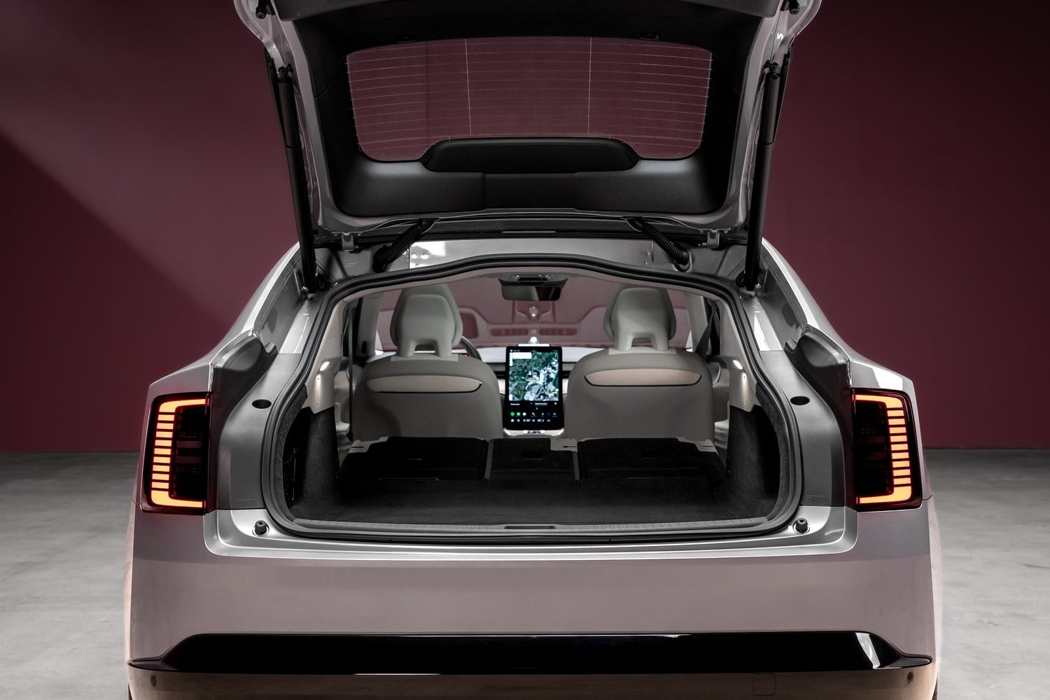 In the side profile, you see where the shift in design approach for the ES90 comes into play. It is no longer a traditional three-box saloon, indicated by the shorter rear end and a more sloping roofline that leads into a fastback-like tailgate, with the most subtle lips on the car’s trailing edge. As seen on the EX90, Volvo fits the ES90 with a lidar scanner atop the windscreen, which will play a crucial role in its suite of safety and driver assistance features to be rolled out over the coming years.