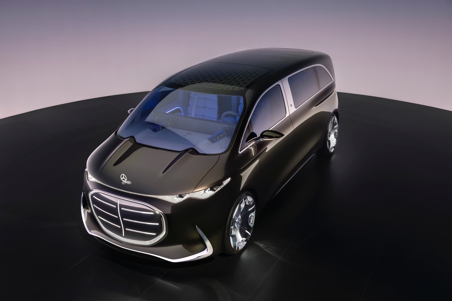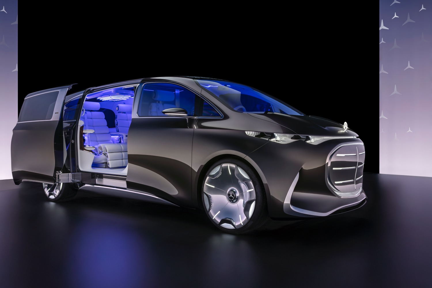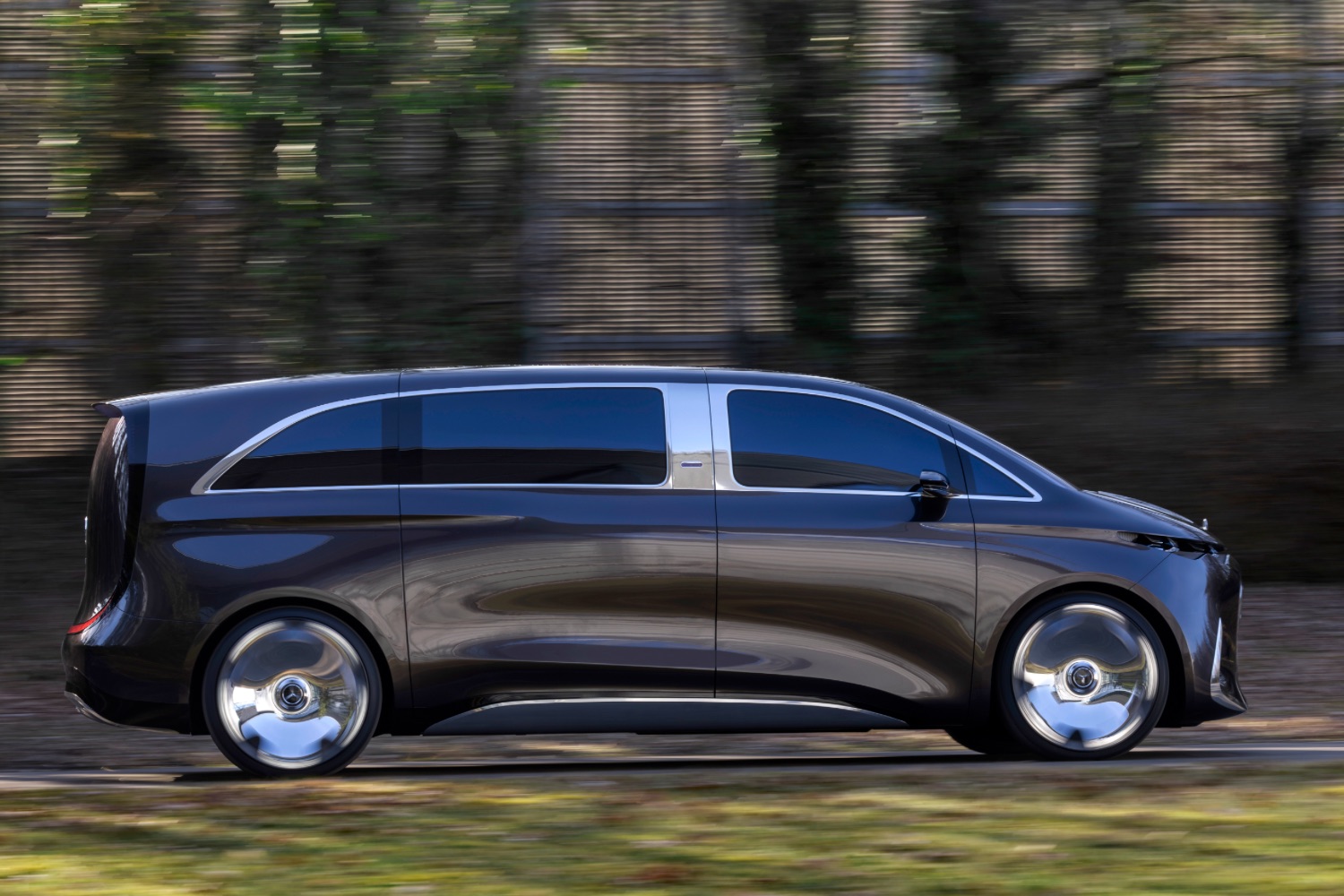 Mercedes-Benz has also claimed the Vision V feels “sporty” because of its new pronounced “powerdomes” on the short bonnet, as well as its large wheel arches. In the concept car, it's all set off with anthracite-coloured, metallic alubeam paintwork and chrome-plated window surrounds, as well as enormous 24-inch wheels with illuminated louvres. Similarly, the rear window is framed by over 450 three-dimensional illuminated louvres that serve as taillights and brake lights.