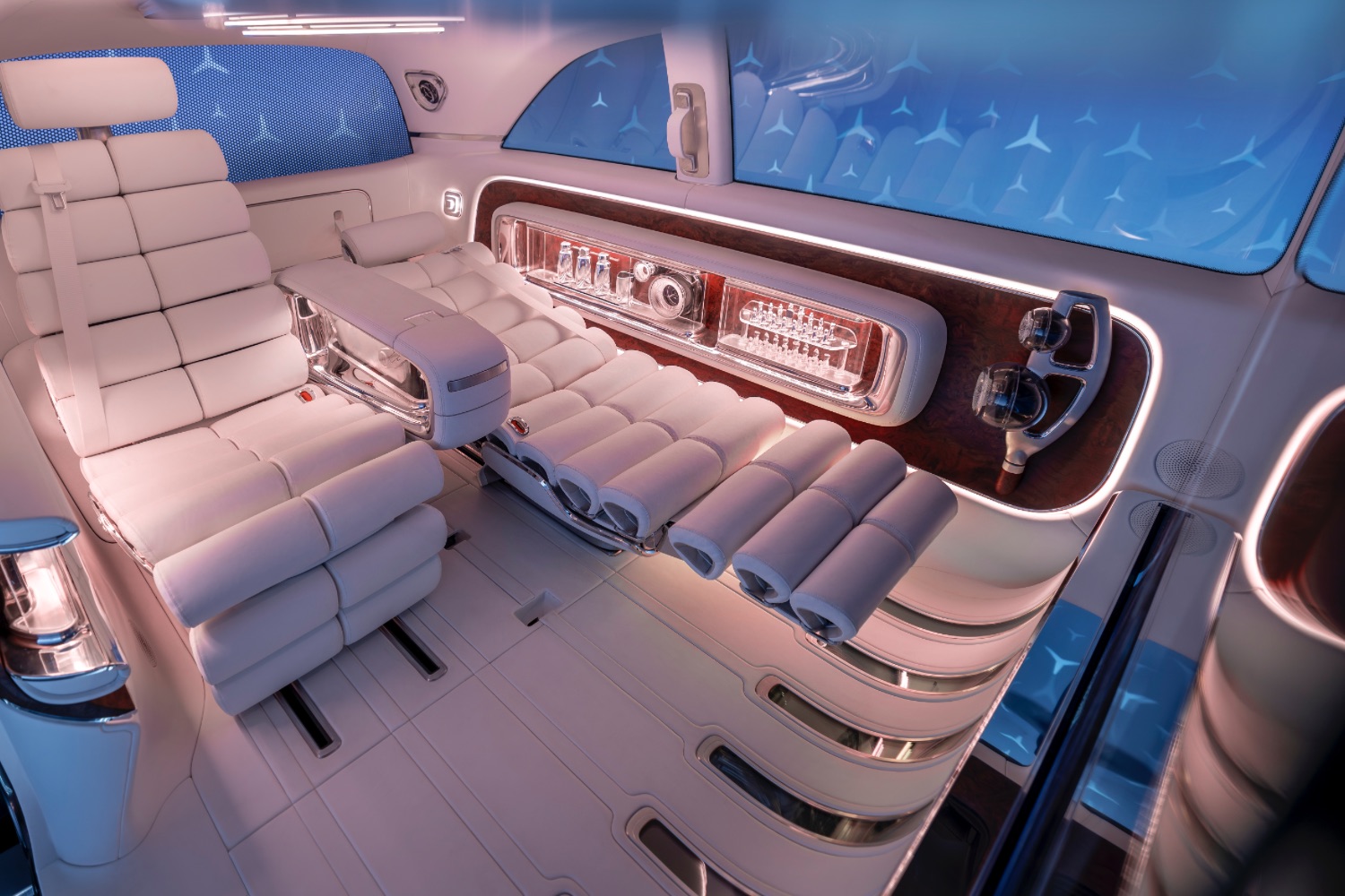 Now you're talking. Mercedes is adamant the Vision V has a “lounge character,” with white leather and silk upholstery, as well as open-pore burr wood. Cabinets designed to look like sideboards line the sides of the cabin, providing storage space for accessories such as a handbag, sunglasses or smartphone. It also offers storage for a game controller and one of the 42 loudspeakers of the surround-sound system with Dolby Atmos, which work in tandem with the massive 65-inch cinema screen.