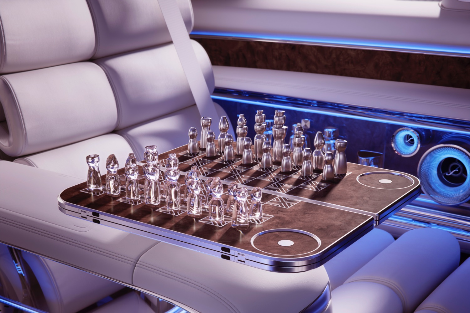 More of those speakers live in glass housings around the cabin, but the 4K screen is still the focal point, folding away into the floor when stowed. And the Vision V backs the screen up with projectors that turn the side windows into secondary screens for a 360-degree experience.