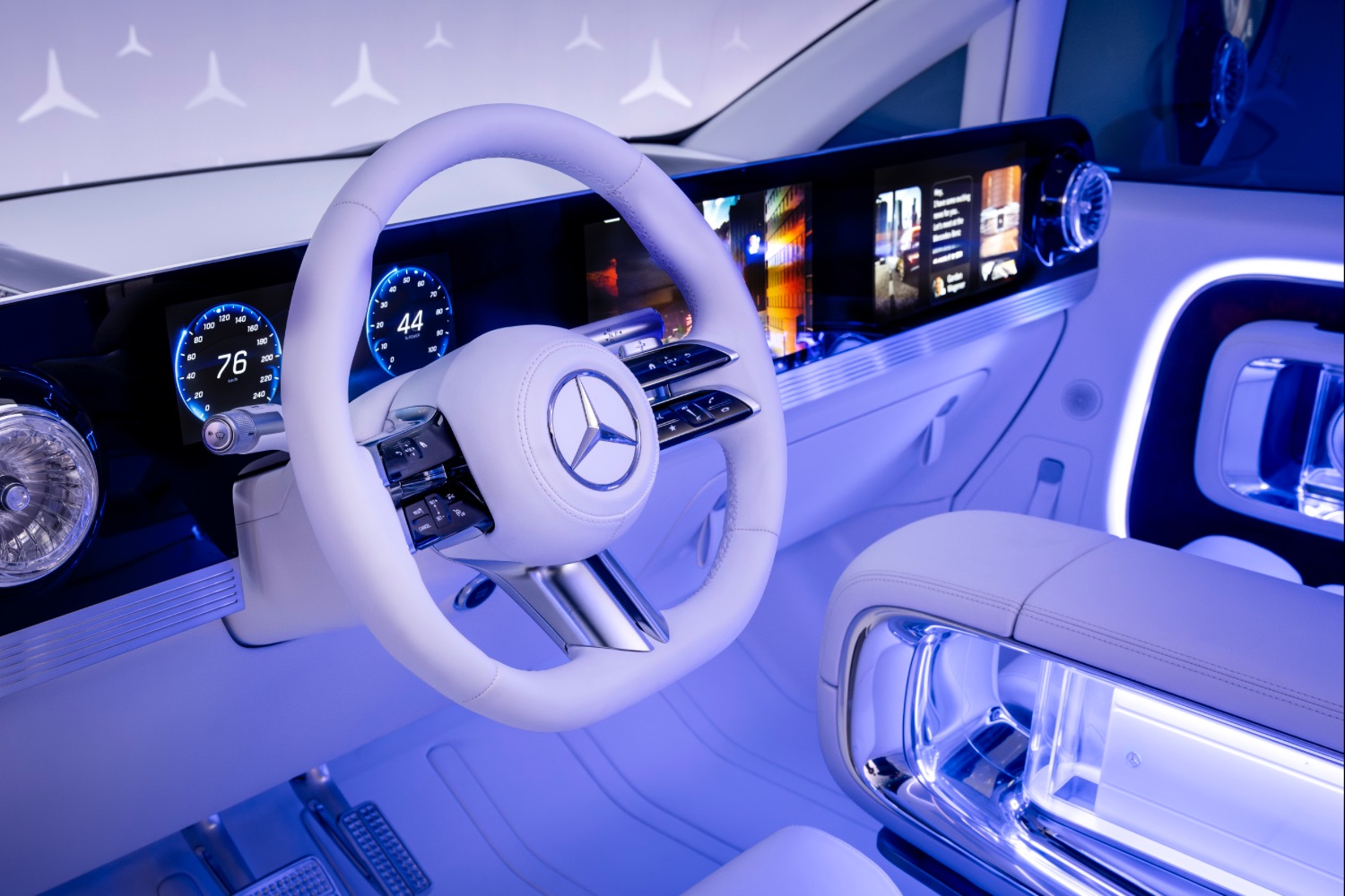 The focus is clearly more on the interior than the exterior, but Mercedes-Benz has confirmed the Vision V has a more aerodynamic design, and the images reveal a bold, illuminated grille-style panel and some modern headlights. Mercedes says the vehicle has “welcome screens” on the B-pillars, giving passengers a “taste of the exclusive, digital world of experience in the interior.”