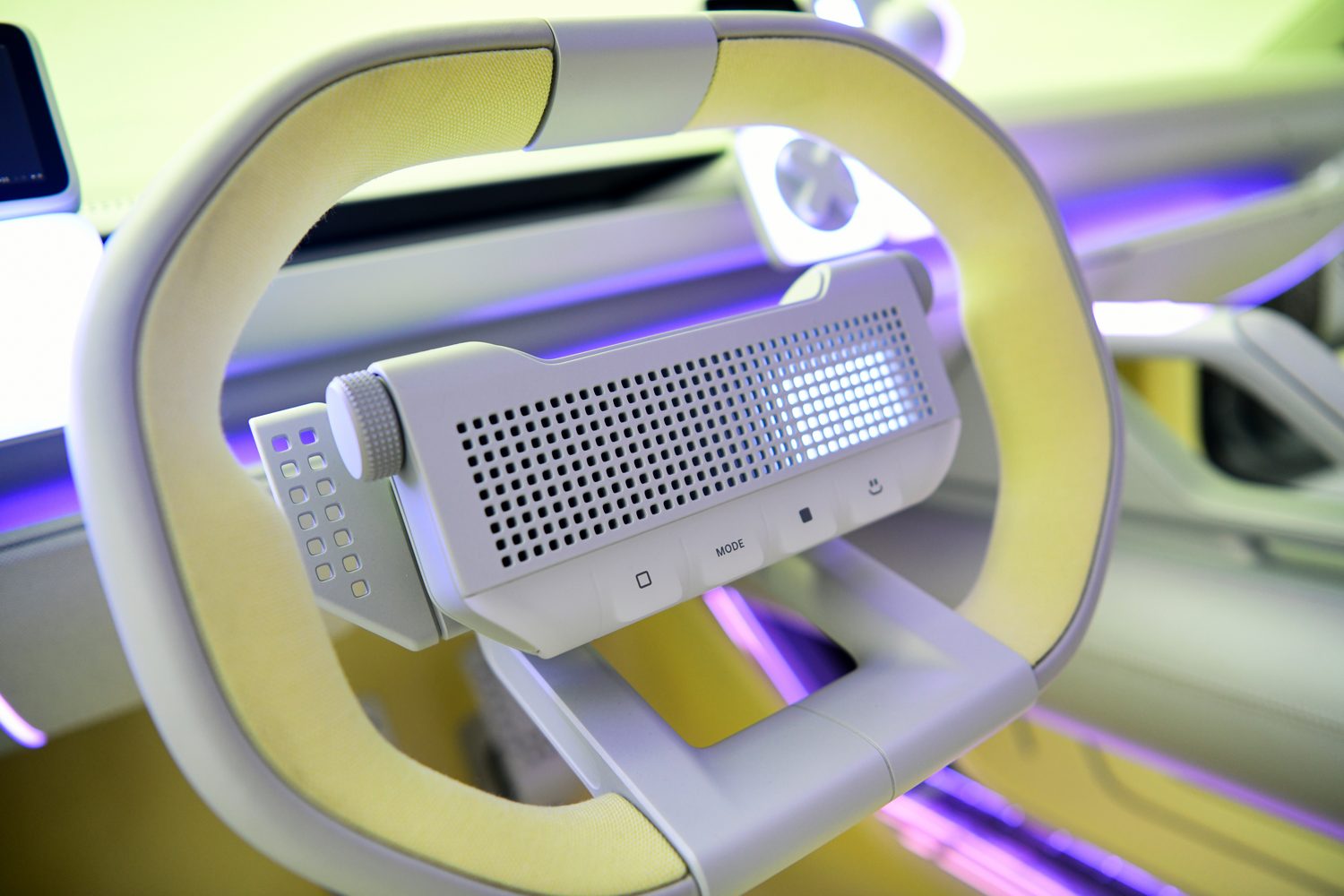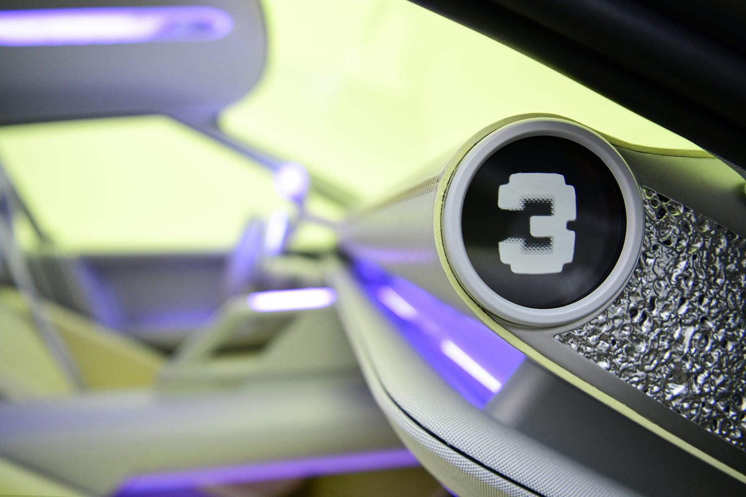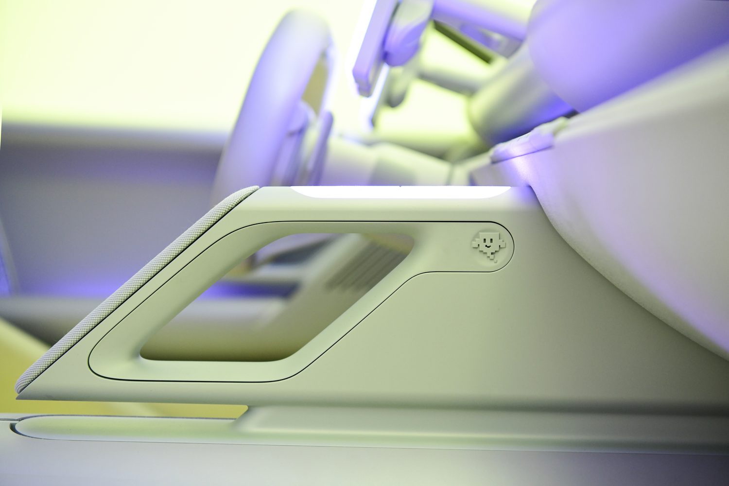 Another pixellated panel on the centre of the steering wheel can relay visual cues and single word messages to the driver. Sustainable details include plastics for the buttons and unusual lightweight aluminium foam inserts that are visible on the inner sections of the doors.