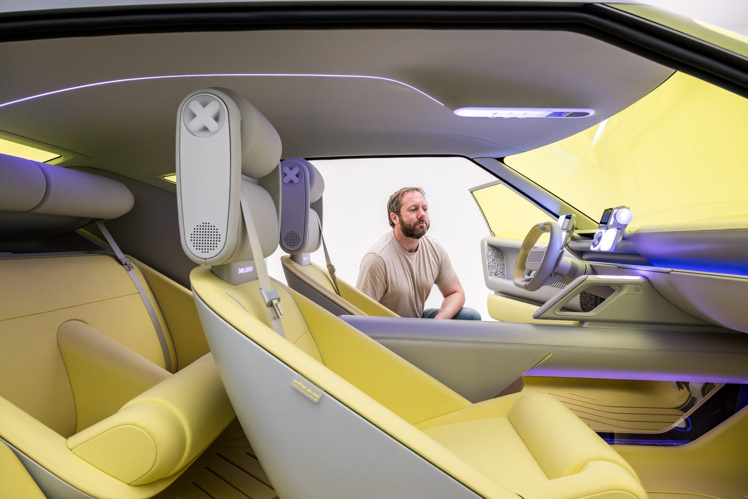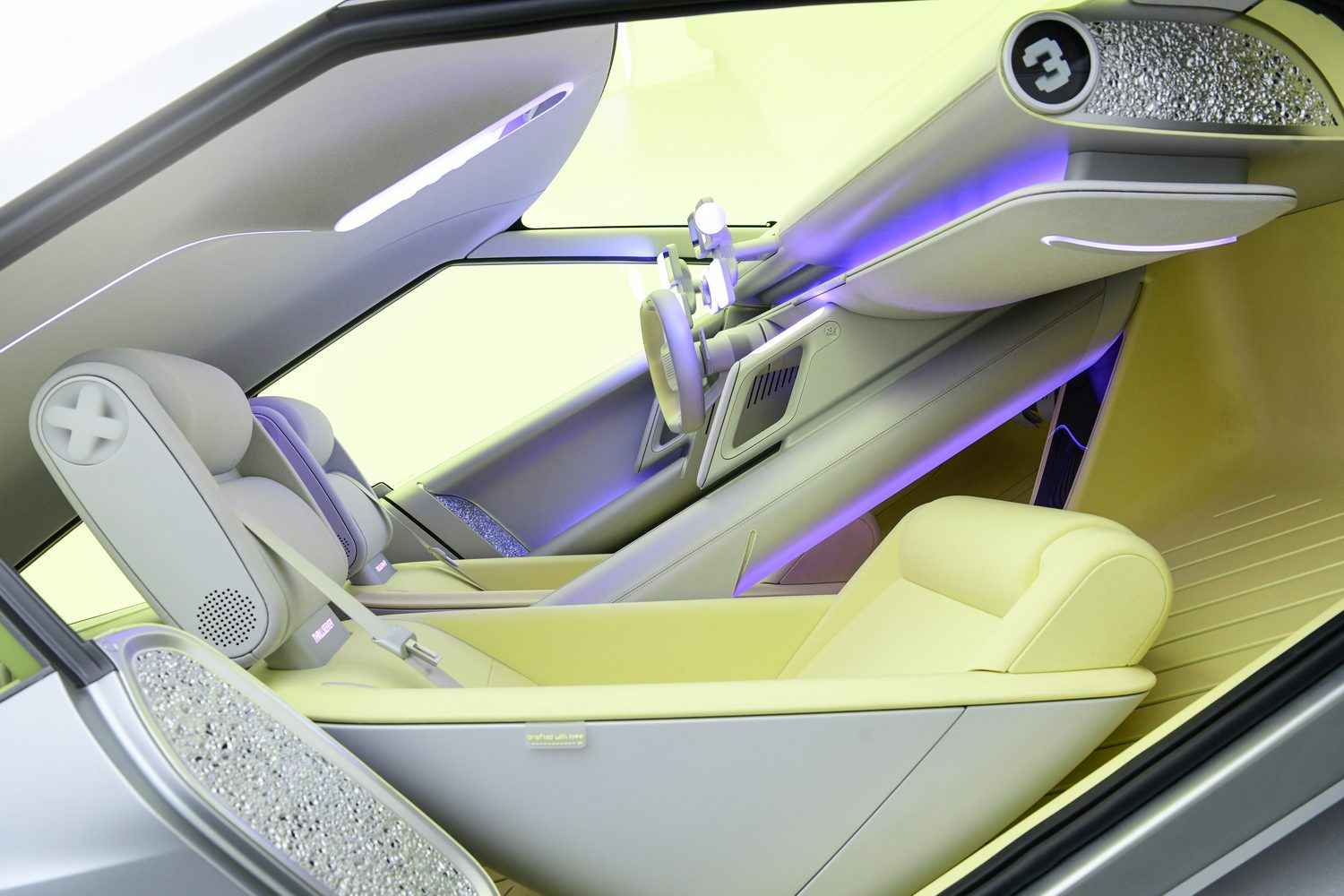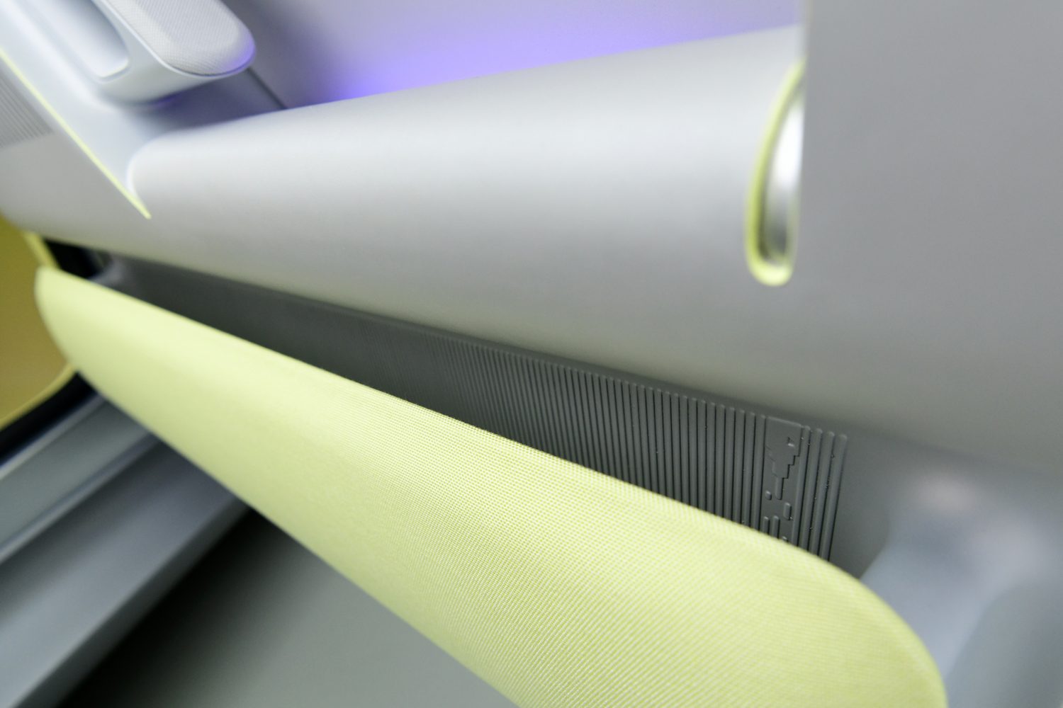 Another pixellated panel on the centre of the steering wheel can relay visual cues and single word messages to the driver. Sustainable details include plastics for the buttons and unusual lightweight aluminium foam inserts that are visible on the inner sections of the doors.