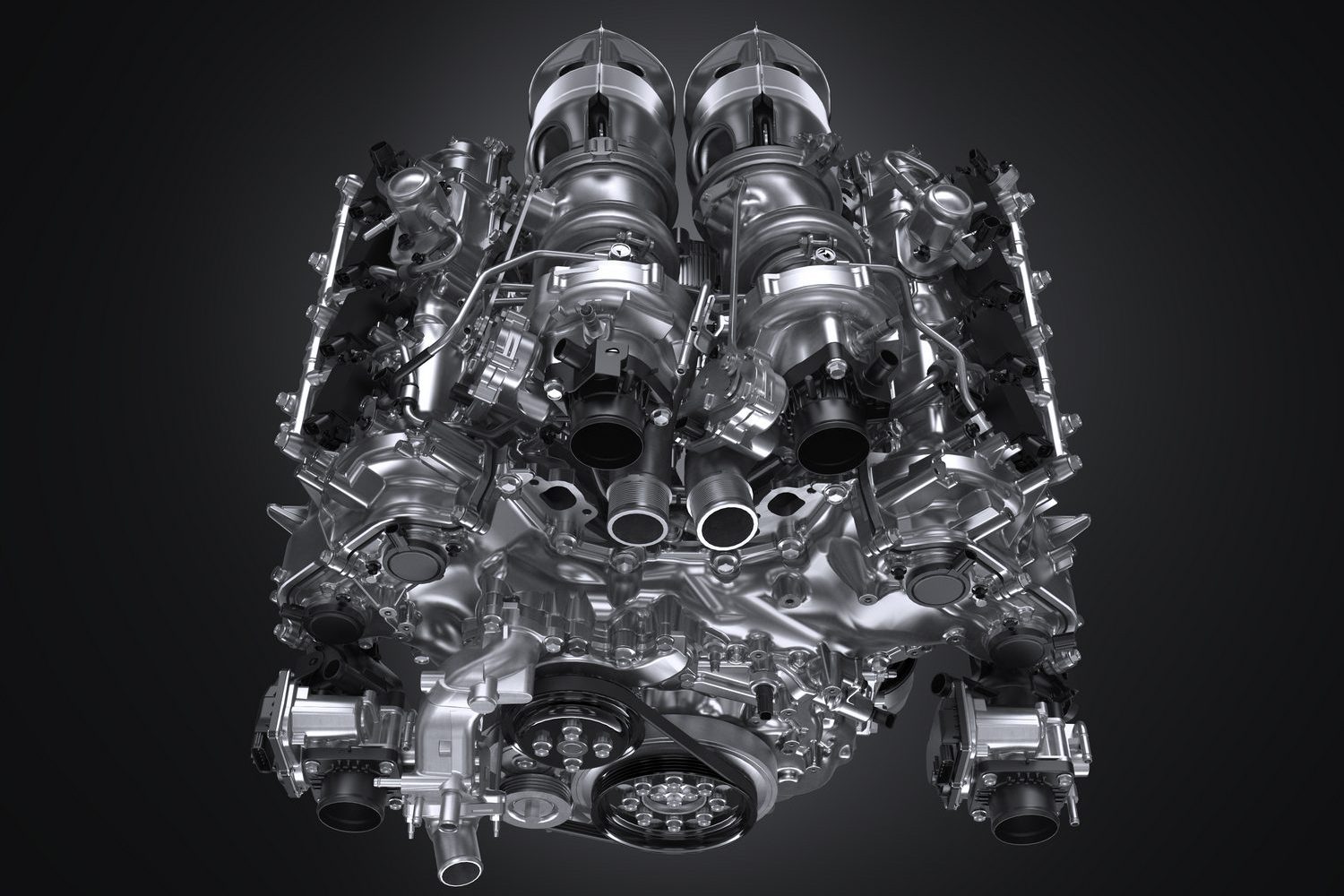 It's a twin-turbocharged 4.0-litre unit with the turbos in the vee and a dry sump underneath. That, and a notably short stroke, were chosen to reduce the height of the engine and hence lower the car's centre of gravity.