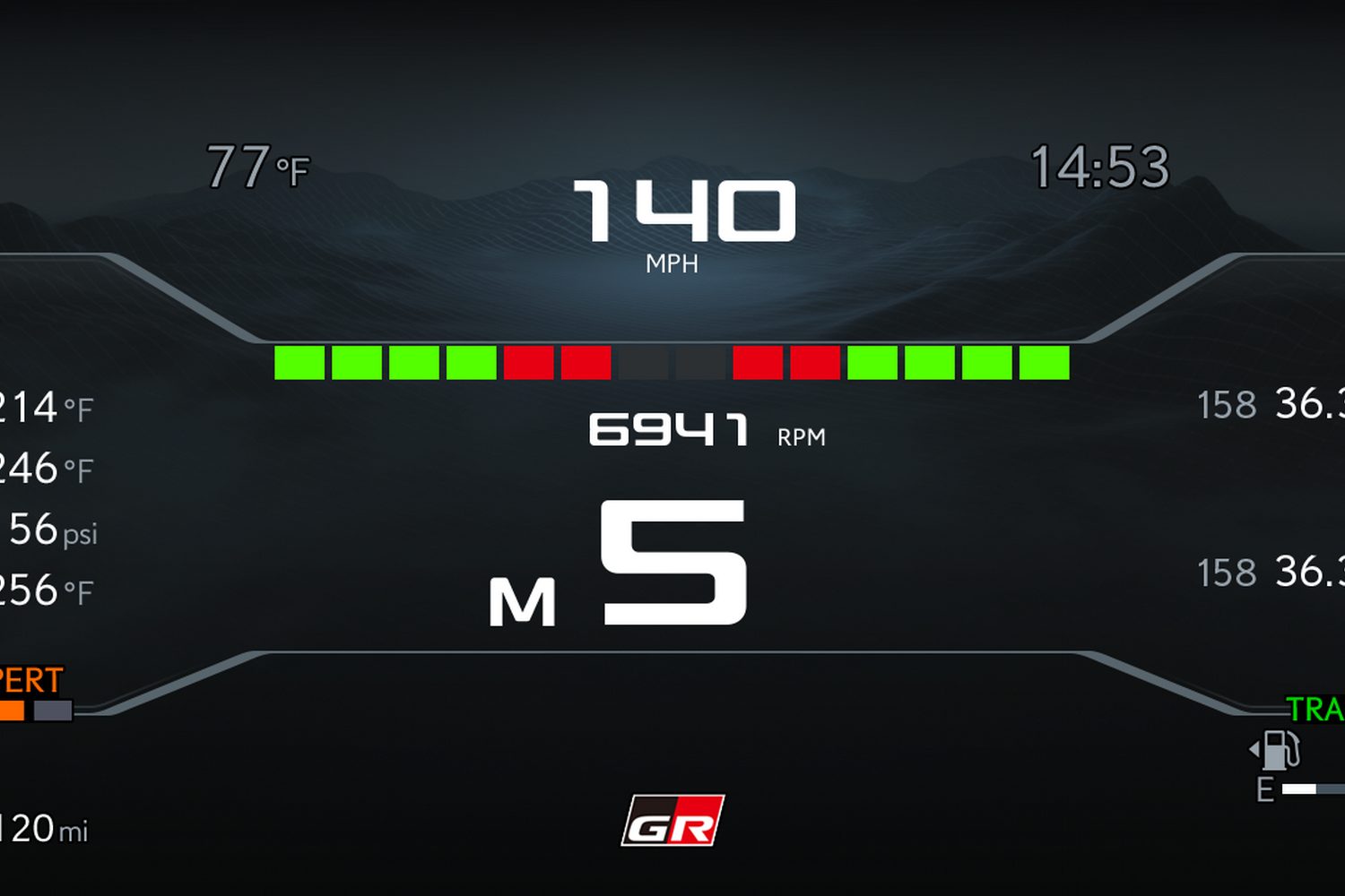 Those digital instruments reveal a few other titbits of information, such as a "Track” setting, and the engine revving at 6,941rpm with one more "change up” light left to go in fifth gear at 140mph (225km/h)... Toyota did say it'll exceed 320km/h.