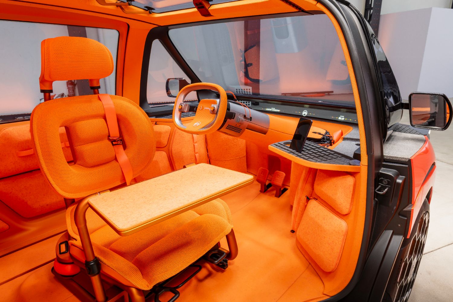 Wait, we haven't even gotten to the good stuff yet. The driver's seat gets its own built-in suspension - foam cushions built into its metal frame - and it rotates through 180 degrees and has an integrated tablet computer holder, so that you can work when parked up.