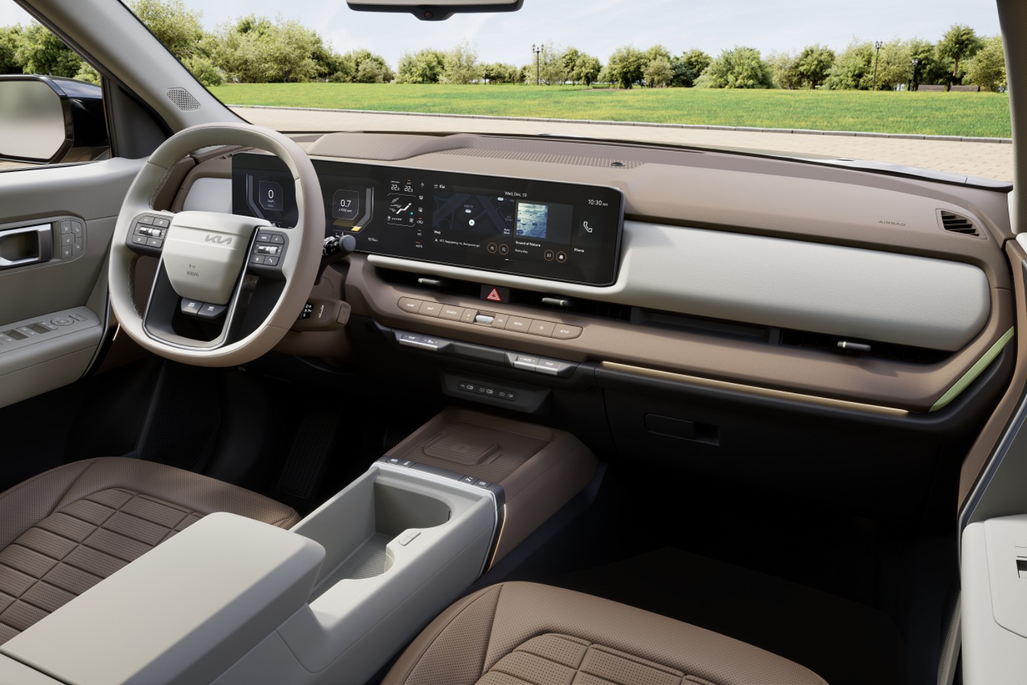 Very much in the current Kia idiom, with a sweep of big conjoined 12.3-inch touchscreens behind the chunky steering wheel, and — thankfully — a smattering of physical buttons and switches too. Basically, the cabin looks very much as if it's been lifted from the current EV3 — no bad thing — and so it inherits that car's column-mounted gear selector (for automatic versions), which opens up way more storage space on the centre console. The rear seats recline, too, which will help with comfort on long journeys. There's quite a lot of high-tech stuff too, including a head-up display, lane-keeping steering, and adaptive cruise control, all available. You can also have a 64-colour ambient lighting setup and a Harmon/Kardon stereo.