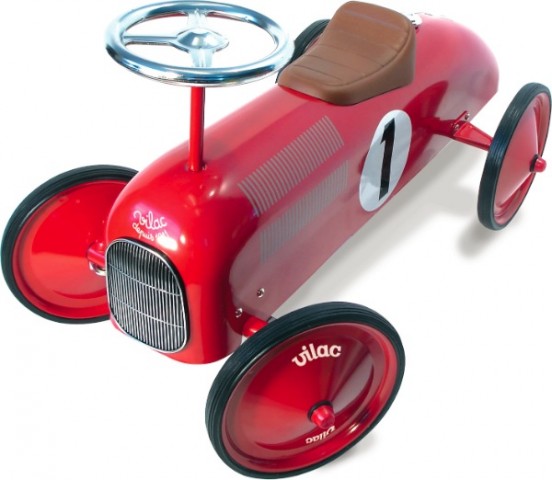 The Vilac vintage ride-on cars feature metal bodies with the obligatory number '1' printed on each side, a brown plastic seat mounted over the rear wheels for better traction and weight distribution and a metal steering wheel with which to control the front wheels. Priced at €125 the ride-on is available in either red or yellow and is the ideal starter for the future Vettel.