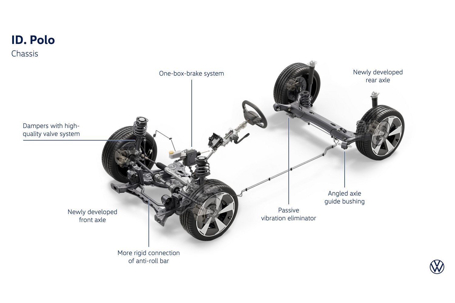 The chassis uses MacPherson struts on the front axle. At the rear, the ID. Polo uses a new type of torsion beam setup aimed at optimising comfort and refinement.