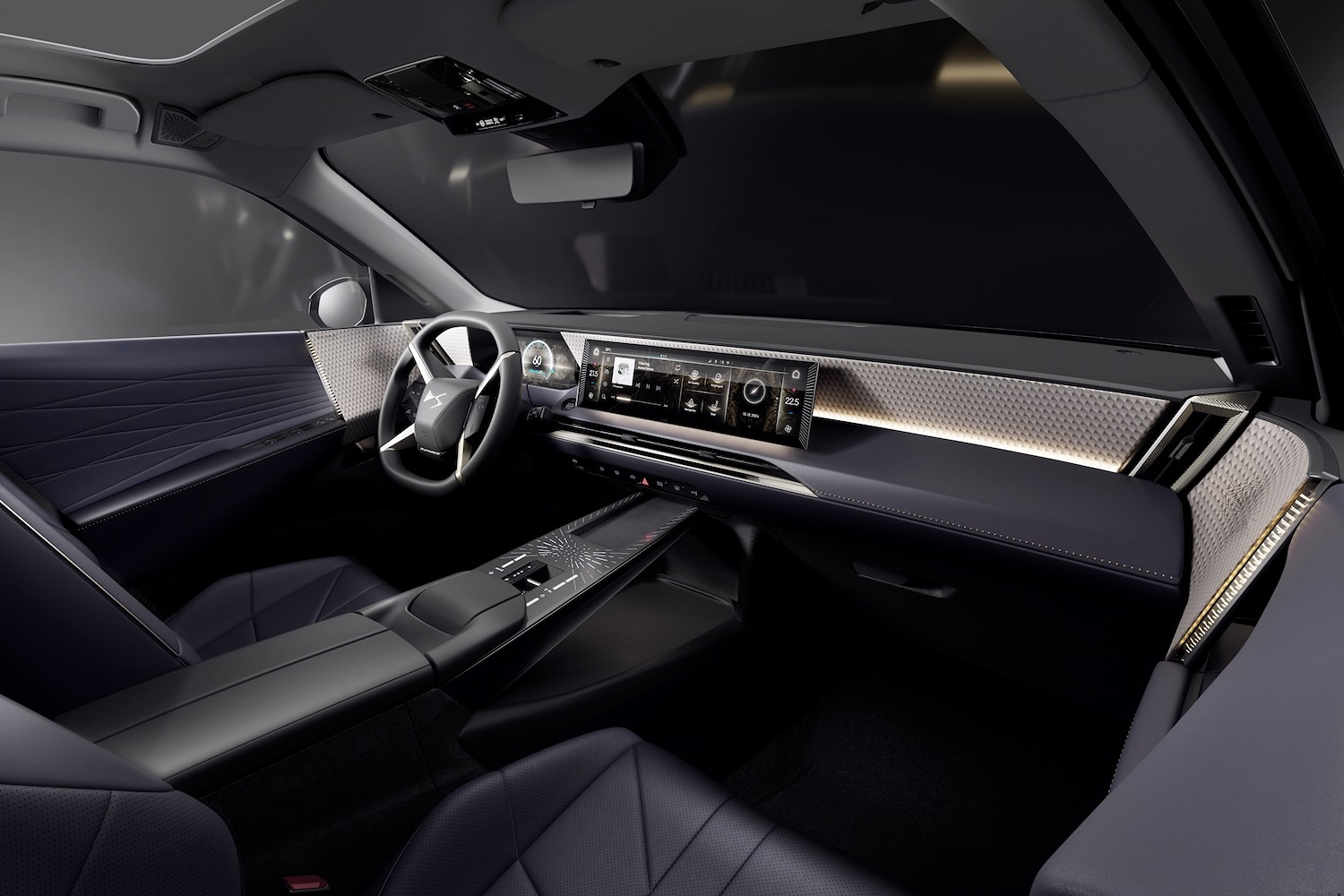 The No.7 uses the DS No.8's really rather cool X-shaped steering wheel, which looks like a cross between the wheel of a sailing ship and the propellor of a classic aircraft, while there's a ten-inch driver's digital display and a 16-inch infotainment screen.
