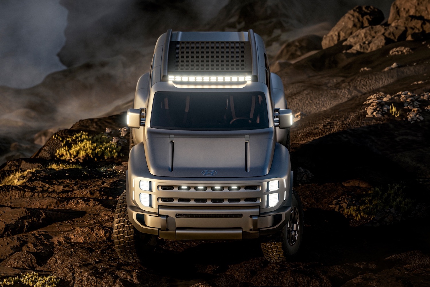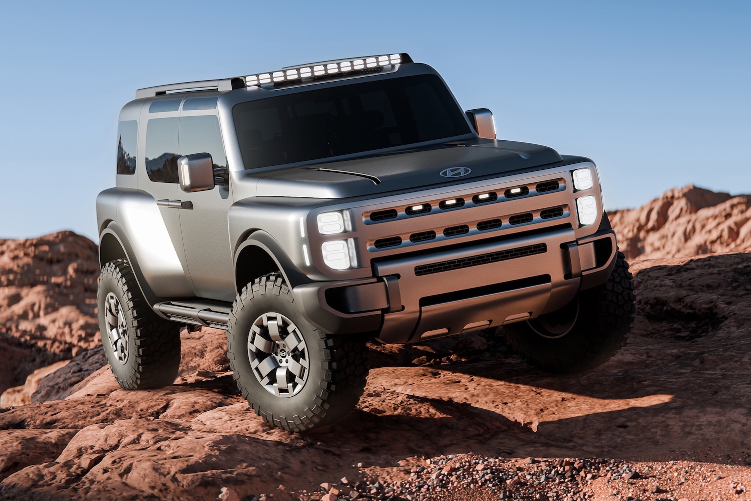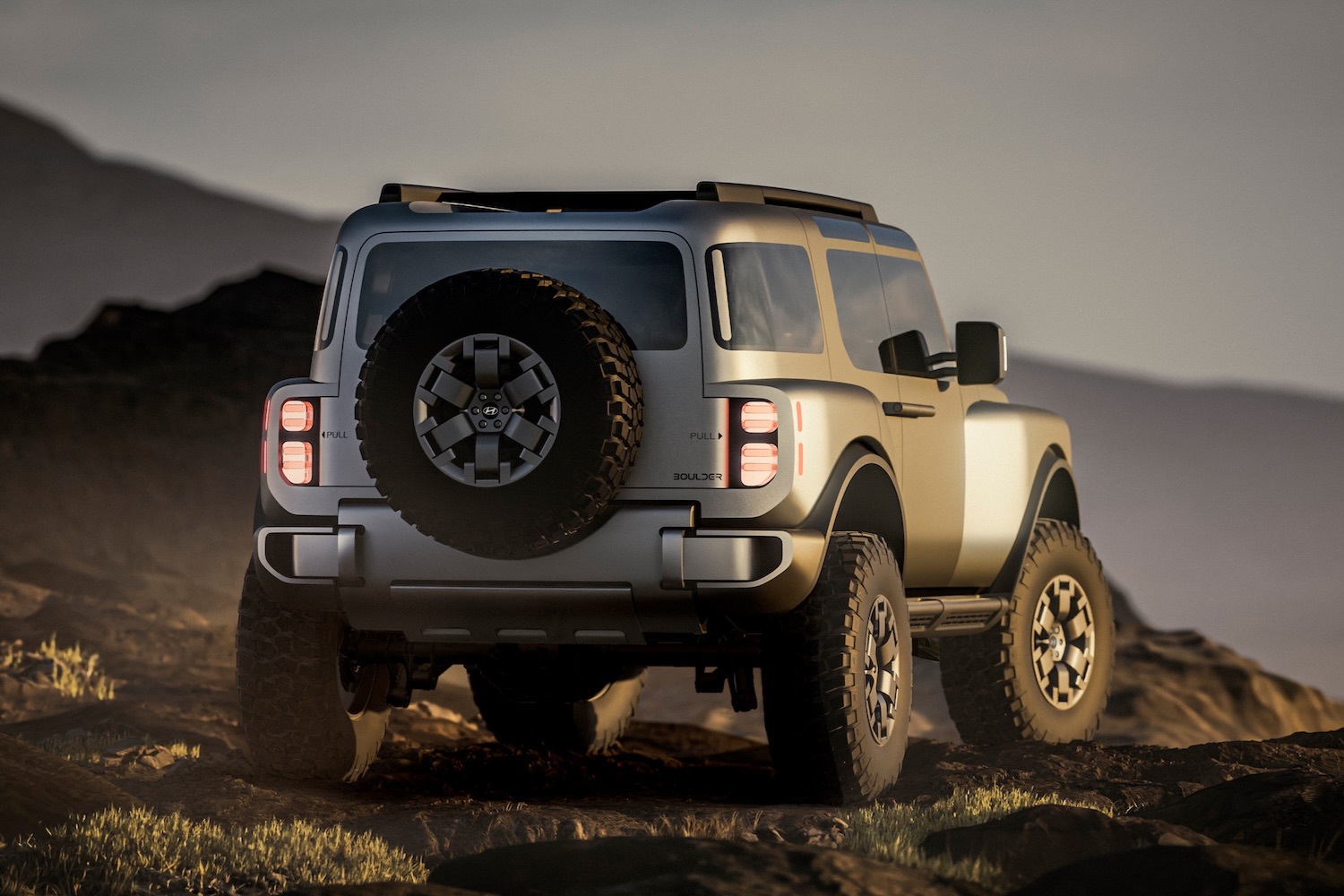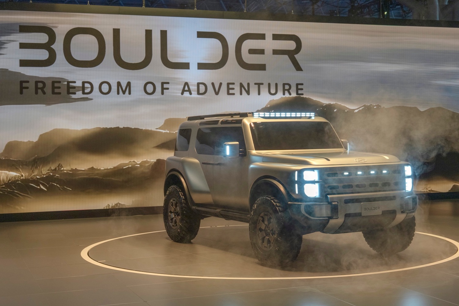 Isn't it, though? Clearly, Hyundai was taking aim at the Jeep Wrangler and Ford Bronco when it designed the Boulder Concept, and from its broad, low grille to its wildly extended wheelarches, it looks every inch the serious off-roader.