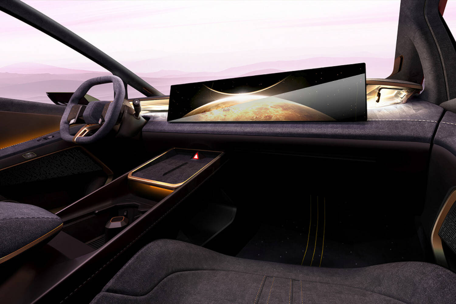 The cabin of the Venus gets a deep centre console that creates a wraparound feel for the driver, while physical switches are entirely abandoned and control subordinated to the massive screen that stretches almost all the way across the dashboard. To give the Venus a true luxury feeling, the cabin is upholstered in suede and even has little flashes of gold embellishment.