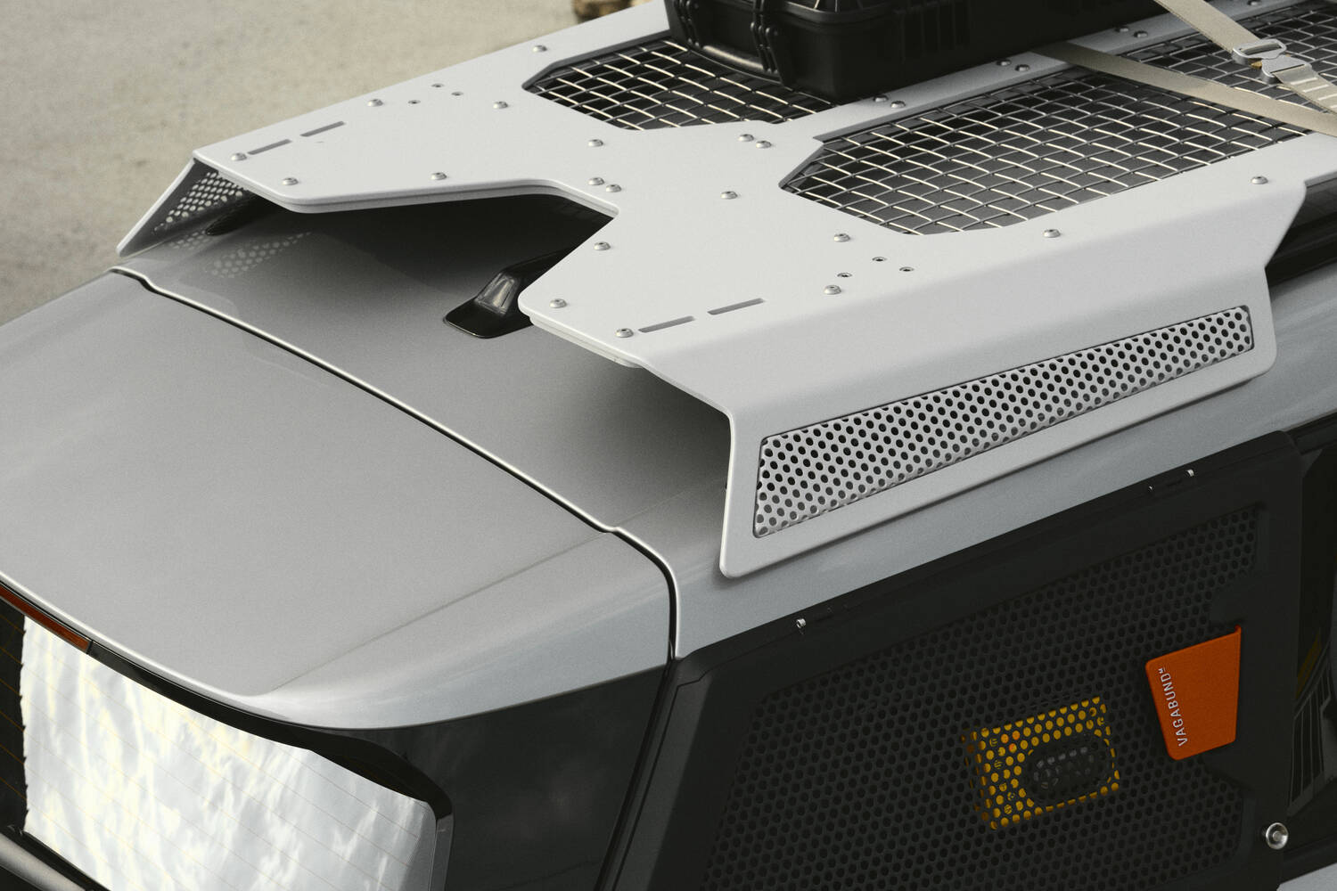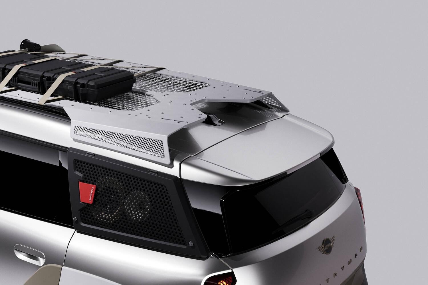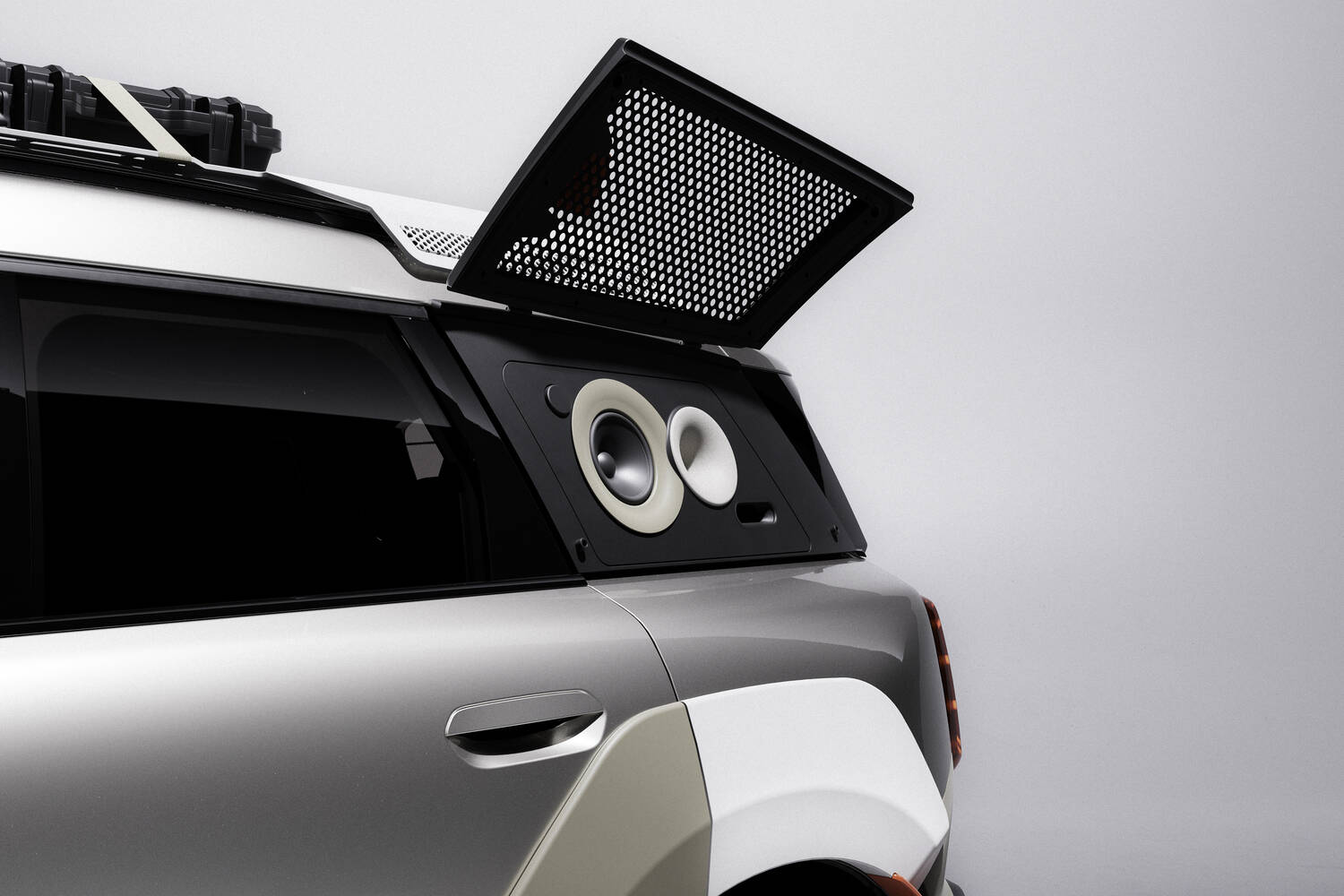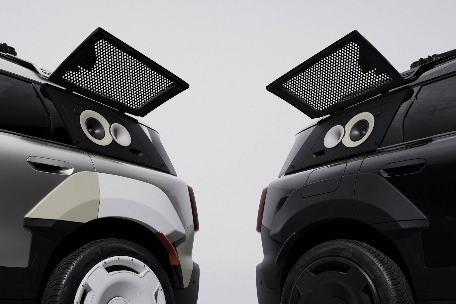 There's also, for both cars, a roof rack made up of three laser-cut and folded aluminium plates, complemented by an integrated stainless-steel mesh as an open surface, and again the design of this is meant to look like a speaker.