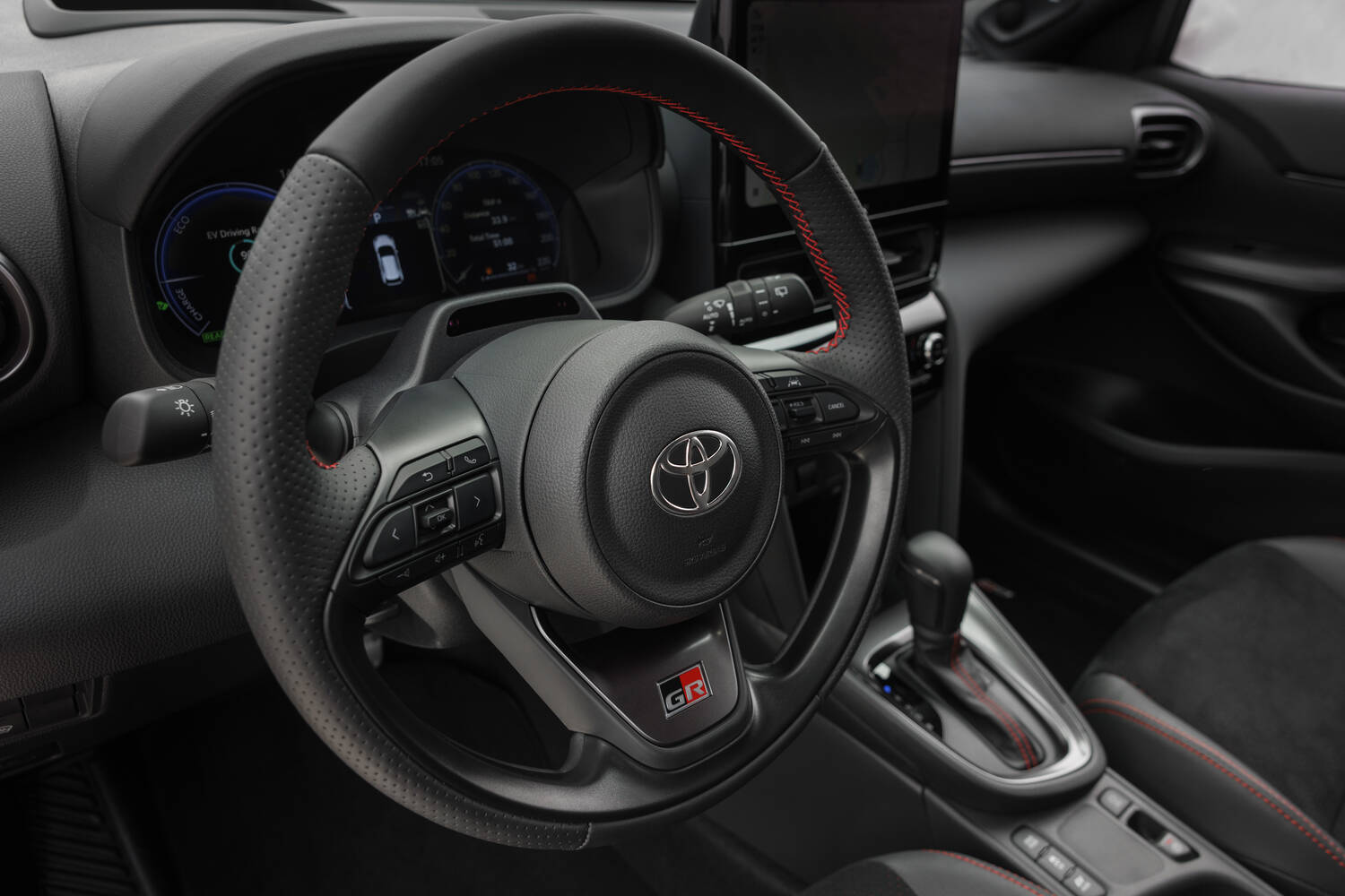 Yup, that's the updated GR Sport model, which gets suede-style sports seats with grey upholstery and red stitching, along with the GR logo on the front headrests and steering wheel, while there are GR Sport-specific gunmetal-silver trim inserts in the doors and instrument panel.