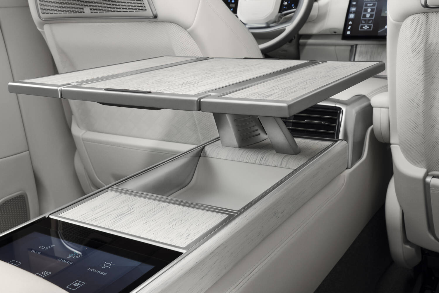 There's a powered 'club table' in the back seats, and an integrated cooler which also has its own powered lid, while you'll find more Orchid White trim on the stereo speakers and seatbelts.