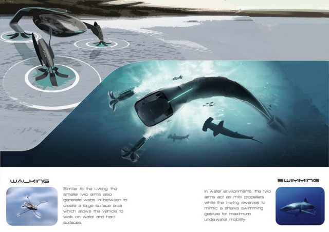 In tighter areas the armatures can act as arms and a tail that allows the SEED to find its way around in the dark and 'swing' if needs be. Kinetic energy can be stored for times like this when energy sources are not close at hand. When close to water the SEED sprouts legs that allow it to walk on the surface much like a water walking ant and it can grow a tail like a shark for underwater activities.