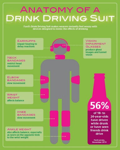 Ford developed the "Drink Driving Suit" with scientists from the Meyer-Hentschel Institut in Germany, a company specialising in research into the effects of mobility impairment. "People trying on the 'Drink Driving Suit' for the first time soon find that they struggle with everyday tasks they would usually take for granted - such as picking up a cup or dialling a telephone number," said Gundolf Meyer-Hentschel, company founder and chief executive officer. "It provides a powerful way of reinforcing the serious message of what could happen when driving under the influence of excessive alcohol."