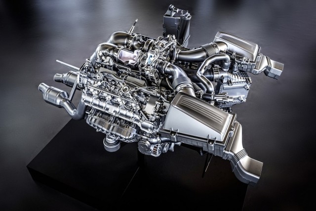 This 90-degree V8 has its two turbochargers mounted inside the cylinder banks, known as a 'hot inside V'. It allows for a compact unit, quicker throttle response due to less lag and low exhaust emissions. Merc has decided to dry-sump this beast, allowing for a lower installation and therefore a centre-of-gravity that's much closer to the deck.