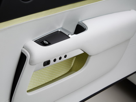 Inside, the main colour scheme is white and black with the accent colour repeated in various details. Points of interest include the two-tone steering wheel that uses something called a 'seamless stitch' - a complex technique borrowed from the world of fine tailoring - to create a neat finish. Silk is used for the door pockets, picking up the accent colour and adorned with an abstract representation of the Spirit of Ecstasy. The emblem is set at exactly 55 degrees to match the design of the door. Framing the door trim is a silk welting strip, using another tailoring technique, to provide a coloured line between the black and white hide.