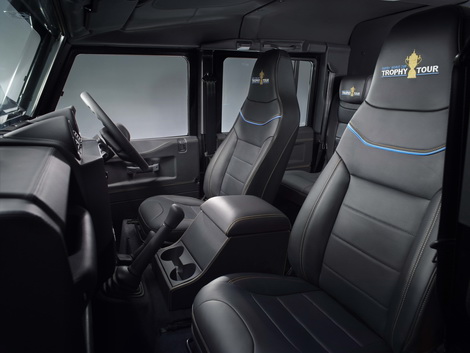 The passenger interior is based on the Defender Autobiography edition and offers a high level of personalised design touches. Black Windsor Leather seats have been embellished with gold contrast stitching and Rugby World Cup 2015 blue piping whilst the contrast stitch extends to the dashboard and doors. The Rugby World Cup Trophy Tour logo takes prominent position being embroidered onto the front headrests.