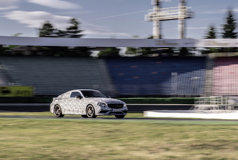 These shots show the Coupé - likely to use the same twin-turbocharged 4.0-litre V8 as the saloon and Estate C 63s - undergoing final testing at a German race track with the syllable 'Ring' in its name.