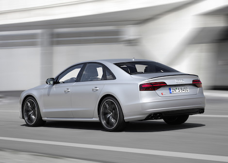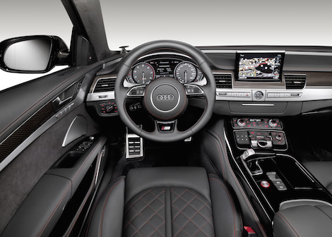 The S8 plus comes in the standard wheelbase A8 and features ambient lighting, convenience key, full-leather interior package, Alcantara package, power-assisted door closing and a DVD/CD changer. Further goodies include Assistance Package with Audi pre-sense plus, four-zone climate control, a Bose surround sound system and MMI navigation plus with MMI touch.