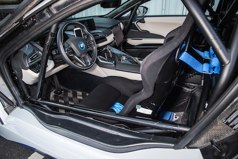 The cabin still retains much of the core architecture of the road-going i8, but extra equipment to enable its role as Safety Car for the Formula E Championship, such as an iPad mounted in front of the co-driver and a number of control switches for the radio and lighting system, has been added. Its roll cage is also the first to be FIA-certified for the BMW i8 while the airbags have been removed and carbon fibre race seats with safety harnesses have been added.