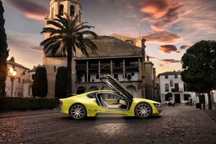Rinspeed doesn't say a lot about the Ʃtos' mechanicals, so it's safe to assume the midships 1.5-litre turbocharged three-cylinder petrol plus front-mounted electric motor drivetrain of the i8 is retained. What makes the car special is that a phalanx of eight HD exterior cameras allow for fully autonomous driving. They continually monitor the surroundings of the car and they can also be used to provide 180-degree panoramic views forward and behind to the occupants. Further, the Ʃtos has a 'Kerb View' which shows the wheels in low-speed manoeuvring, to prevent knackering the alloys, and the ability to navigate to a previously reserved space in a car park, thanks to pinpoint precision mapping. Of course, as fully autonomous cars are unlikely to be ratified for a few years yet, a lot of this is hypothetical show stand stuff for now, but we digress...