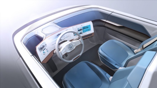 With its 'Nevada White' bodywork and 'Phoenix Copper' roof, the Budd-e looks surprisingly un-retro - we had been expecting something that more obviously looked like a classic Type 2 'Splittie.' Volkswagen appears to be rather more keen on looking to the future though, and that's certainly apparent inside. The whole instrument panel wraps around the driver, and Volkswagen says that the two massive screens (one for instruments and one for infotainment) effectively blend into one another. There's high-tech gesture control, which means you'll hardly ever have to actually touch those screens (no unsightly finger prints) and a voice control system, which can recognise generic phrases, rather than specific commands. It's apparently so clever, that the four-zone climate control system can hear someone complain about the temperature in their corner of the car, and adjust it to suit.
