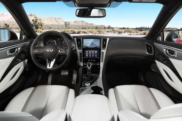 A 'driver-centric' approach and typically neat 'n' tidy Infiniti dash design with contrast stitching make this 2+2's cabin look inviting, although it's more Infiniti's dedication to reducing noise, vibration and harshness (NVH) that we're pleased about. All Q60s will come with acoustic glass and Active Noise Cancellation, for instance, the latter of these an item which broadcasts a soundwave from the speakers that's the inverse of the collated rumblings of the engine, tyres and wind buffeting the body.