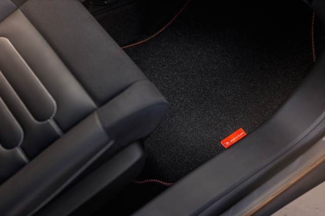Orange is the signifier in here, where it clashes brightly with the Mica Grey fabric seats (standard) or optional black part-leather upholstery. Orange features on the seat belts, the stitching of the floor mats and around the loudspeakers of the Rip Curl's sound system. There's also a logo for the surfing company on the floor mats, with all this garishness set against a Stone Grey ambience.