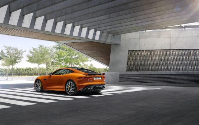 Overall, the SVR is 25kg lighter than the standard car, and you can increase that weight loss to 50kg if you go for the optional ceramic brakes and, on the Coupe, the carbon fibre roof. There's a bigger rear wing, which Jaguar says delivers real reductions in lift even in its folded setting, and that's backed up by totally altered aerodynamics, which include a massive rear diffuser and a floor made as flat and smooth as possible. Even the exhaust has been split into two sections to allow the underbody aero to be more effective.