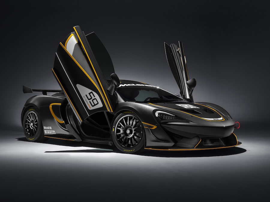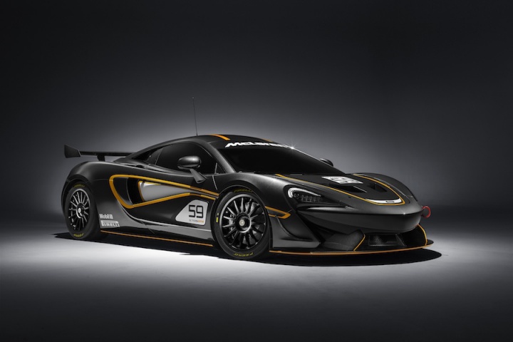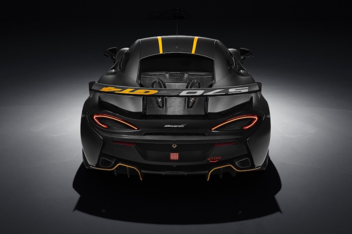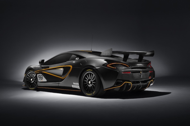 Powered by the familiar 3.8-litre twin-turbo V8 engine and driving through a seven-speed gearbox, the GT4 has a MonoCell II carbon-fibre chassis, with carbon and aluminium used extensively in the reprofiled bodywork. The GT4 has wider tracks front and rear than the road car, in order to accommodate centre-locking cast magnesium alloy wheels, while two-way adjustable motorsport dampers with coilover springs are fitted. To comply with regs, an air jacking system, FIA-approved rollcage and fire extinguisher system are all on board.