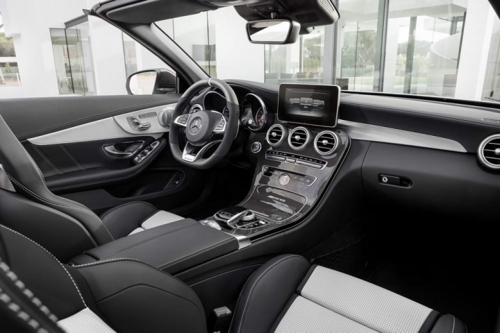 Sporty interior cues build on the standard, luxurious C-Class Cabriolet cabin. Artico man-made leather clothes the instrument panel and there's plenty of aluminium trim, plus a classy IWC analogue clock (depending on trim level). AMG-specific switchgear for the Dynamic Select, Ride Control, three-stage ESP and AMG Performance Exhaust system with flap control abounds, while the steering wheel sports a 12 o'clock marker; behind it, the carbon fibre-look speedometer reads up to 320km/h. Sports seats come as standard but deeper bucket Performance chairs are an option.