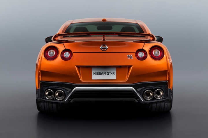 Nissan calls the restyle of the GT-R's conk a 'complete makeover', but you'll perhaps notice that it's not quite that drastic. Key elements to note include a chrome matte finish V-motion grille with a mesh pattern, which is enlarged to allow better cooling, a new bonnet which continues that V-shape up towards the windscreen, and a fresh front splitter with a redesigned bumper. The 'lightning bolt' headlights make it through the cut, though.