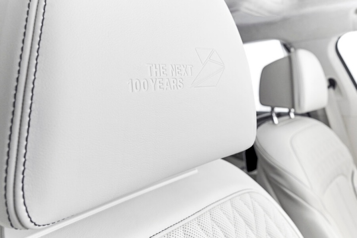 High-end writing implements aside, the Centennial has a BMW Individual headliner in Smoke White Alcantara, Piano Finish Black trim elements in the door cards and on the leather-wrapped steering wheel, and that same 'The Next 100 Years' logo as seen on the outside, here situated on trim above the glove compartment and on all the head restraints. The cup holder's cover in the centre console bears the inscription '1 of 100'.