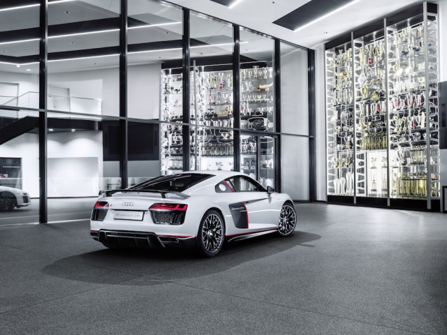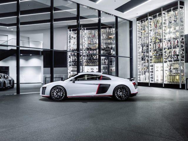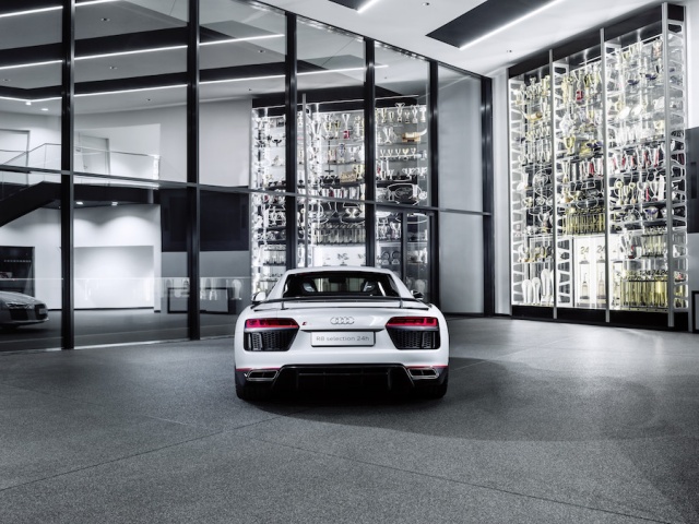 Slotted in the midriff of the R8 Selection 24h is the same 610hp/560Nm 5.2-litre normally aspirated V10 engine which drives all four wheels through a seven-speed S tronic transmission. That means the Selection 24h is capable of numbers that would not disgrace a race car, such as 0-100km/h in 3.2 seconds and a 330km/h maximum. Again, two things that are options on a V10 plus are chucked in for 24h buyers, which are dynamic steering and the Audi magnetic ride adaptive damper control system.