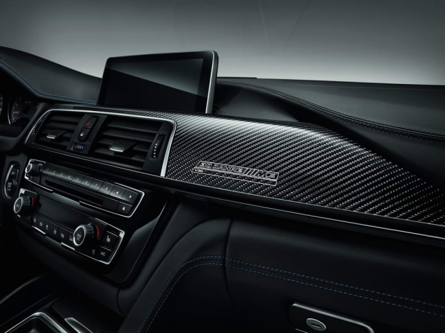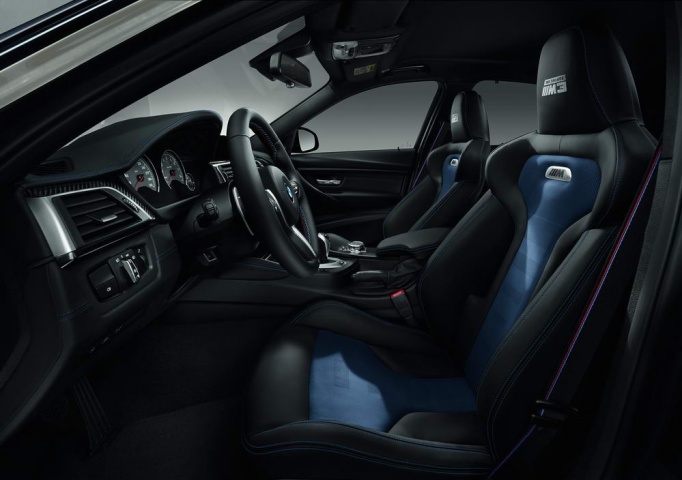 On entering the car you'll see the 'M3 30 Jahre' logo on the door sills and the build number on a piece of carbon fibre trim in the dashboard. The Competition Package is obvious elsewhere, with gorgeous M sports seats and seatbelts with the BMW M stripes woven in. Other additions include the BMW M Performance Steering wheel and the Alcantara BMW M Performance Gear Selector trim and surround. For the '30 Jahre' there is full Merino leather trim in Black/Fjord with colour-matched contrasting seams and the '30 Jahre' logo embroidered into the front headrests.
