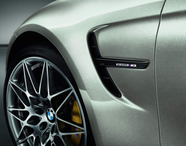 The M3 '30 Jahre' comes as standard with the Competition Package launched earlier this year, including forged 20-inch alloy wheels with mixed tyre sizes (265/30 front; 285/30 rear) and black chrome exhaust outlets for the M sports exhaust system. But the way to tell the new car apart is its paint colour. It's finished in BMW Individual Frozen Silver metallic paint (the '30 Years M3' car sold elsewhere in the world will be in Macao Blue metallic, which was apparently a special option on the first generation M3). Oh, and the gills in the front wings are uniquely branded.