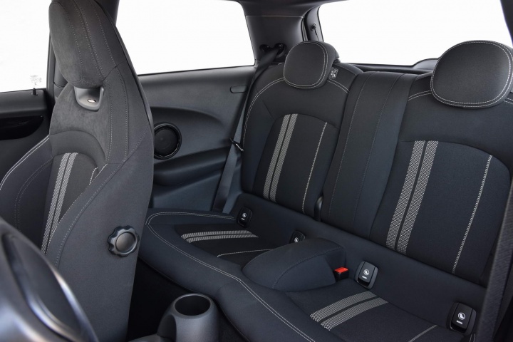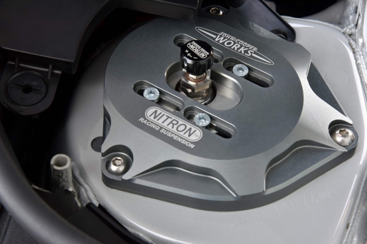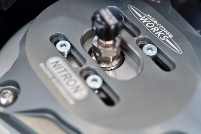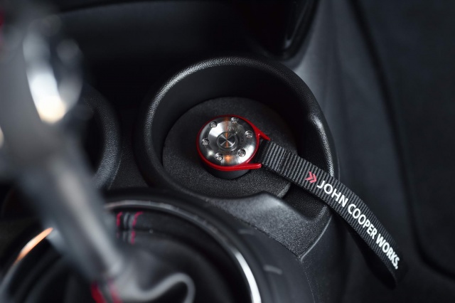 On the outside, the JCW body kit parts bin has been raided, for a super aggressive look thanks to a lower front splitter, rear spoiler add-ons for the already large roof spoiler and rear diffuser. There is also a carbon-fibre finish for the bonnet air intake and the door mirror caps.