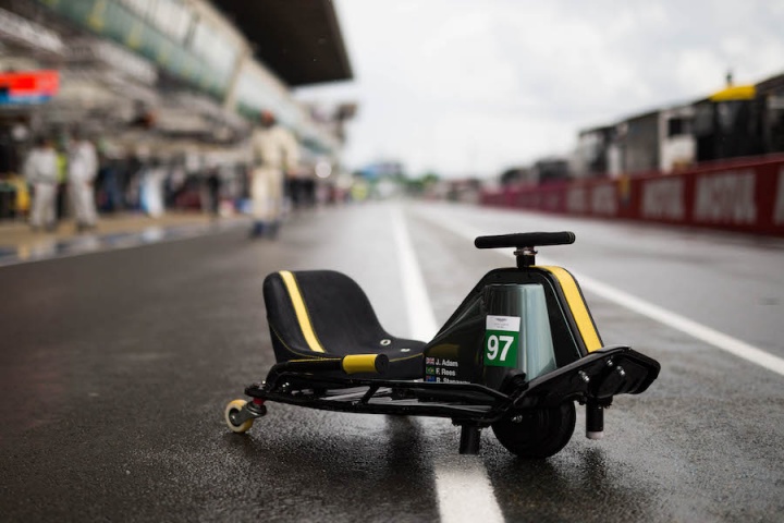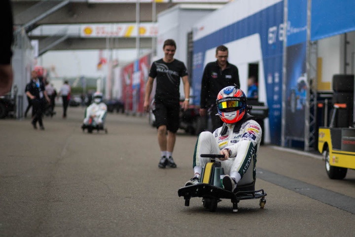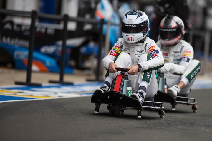 Ahead of tomorrow's 84th running of the great Le Mans 24hrs, the Aston Martin team drivers took to the track for some fun (or possibly some sneaky extra practice) in (on?) modified Razor Crazy Carts, hurling them up around the Dunlop Bridge complex.