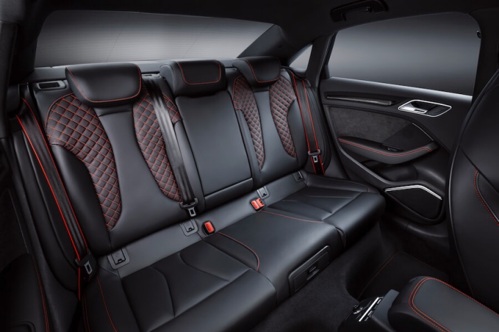 With 400hp and 480Nm of torque, the engine ends power to all four wheels (natch) via the seven-speed S-Tronic gearbox and the Haldex version of the quattro drivetrain. Progressive steering, four-link rear axle, a tight setup and lowered by 25mm relative to the standard model allow Audi to claim that "the chassis of the RS 3 saloon is the perfect partner for the powerful drive system. From its stable centre position, the RS 3 saloon spontaneously steers into curves and follows through with superior precision."