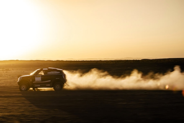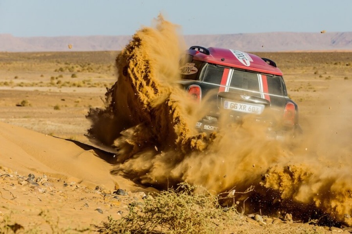 The JCW Rally's body is made from a carbon fibre/Kevlar composite (its overall weight is a still-hefty 1,952kg, though) and three spare wheels with tyres are stored underneath the car on hydraulic jacks. That lowers the centre-of-gravity, which is handy for a competition car. Additionally, the JCW Rally sports a new racing livery for the MINI team and the alloy wheels on the vehicle are derived from the road-going JCW accessory collection. Finally, like a lot of rally raid cars, the air inlet for the car is integrated into the roof, the opening framed by the original roof racks.