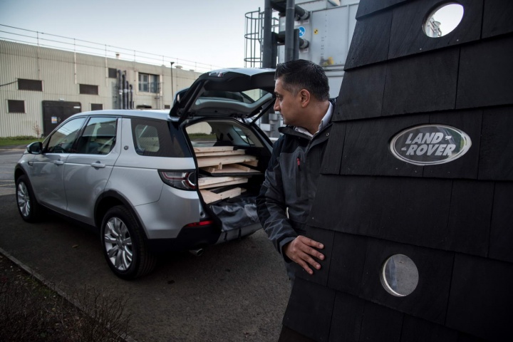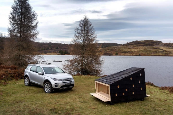 It's fully eco-friendly of course, made from sustainable materials, and sits off the ground on 212mm wooden struts designed to mimic the Disco Sport's ride height. And to keep the damp and wolves out, naturally.