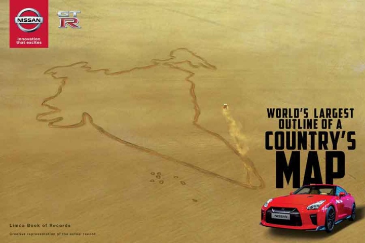 A Nissan GT-R has drawn the largest ever outline of the map of India, to celebrate both the car going on sale in the country and the 68th year of the Republic (January 26 being India's Republic Day national holiday).