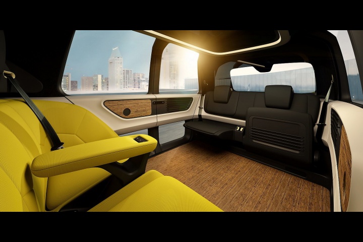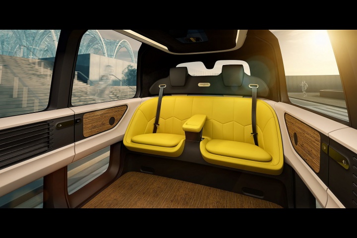 As the Sedric pulls up, you'll notice that it's LED lights do the same looking and winking that we've already seen on the ID and ID Buzz concepts. Then the two side doors open up wide, you step into the bamboo-lined cabin (complete with potted plants to help oxygenate the air) and off you go. There are two individual fixed seats on one side, and a pair of taxi-style seats with flip-up bases on the other, which can make way to make room for buggies or wheelchairs.