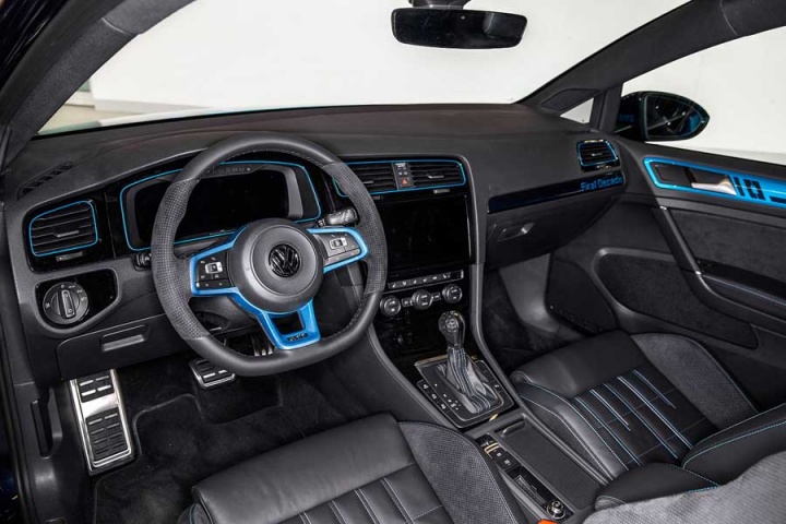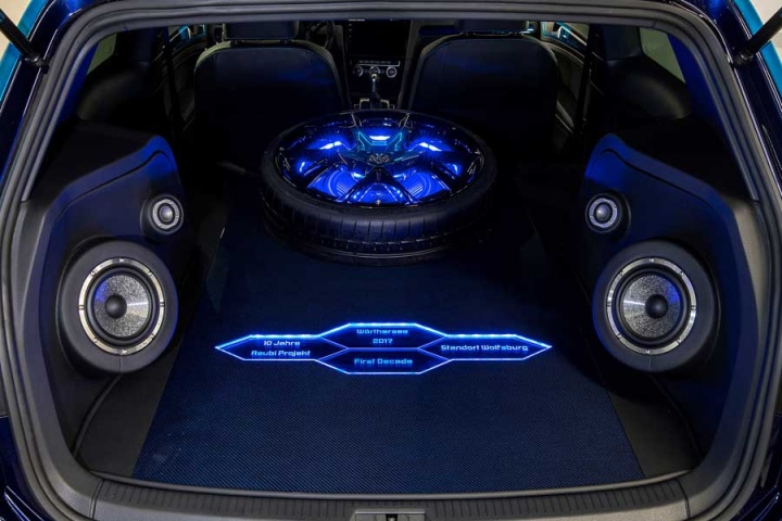 Outside, under the bonnet and within, the Golf GTI First Decade is finished in a variety of blues, to reflect the 'colours of the lake and sky' at Wörthersee, and the Volkswagen sits on mighty 20-inch alloys. There are no rear seats in the First Decade, either, the space they'd usually take up and the boot area instead dominated by a 1,690-watt, 11-speaker sound system with blue LED lighting.