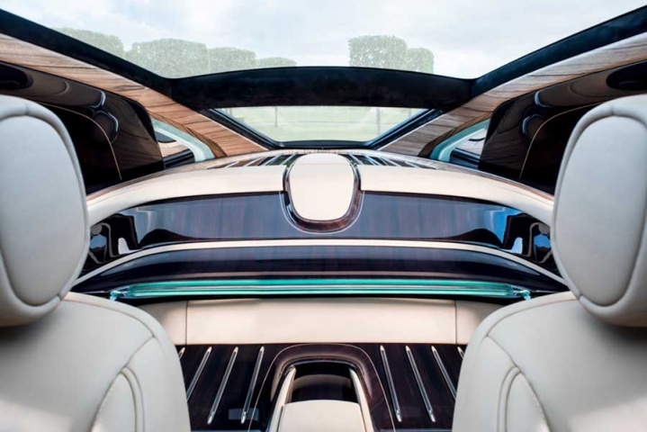 The rear end tapers almost to a point in the style of racing powerboats of the 1930s and up top, the Sweptail has one of the largest and most complex glass panoramic roofs ever made. Inside, it's a strict two seater, with a minimalist dashboard and the visible button count kept down to a minimum. There's copious wood trim and wood decking in the luggage compartment. The clock, inset into the dashboard, has its figures and dial picked out in titanium, as are the main instruments.